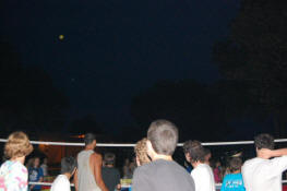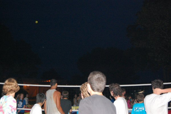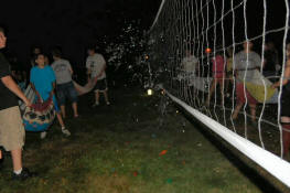 soaring over the volleyball net, landed at their feet, splattering water